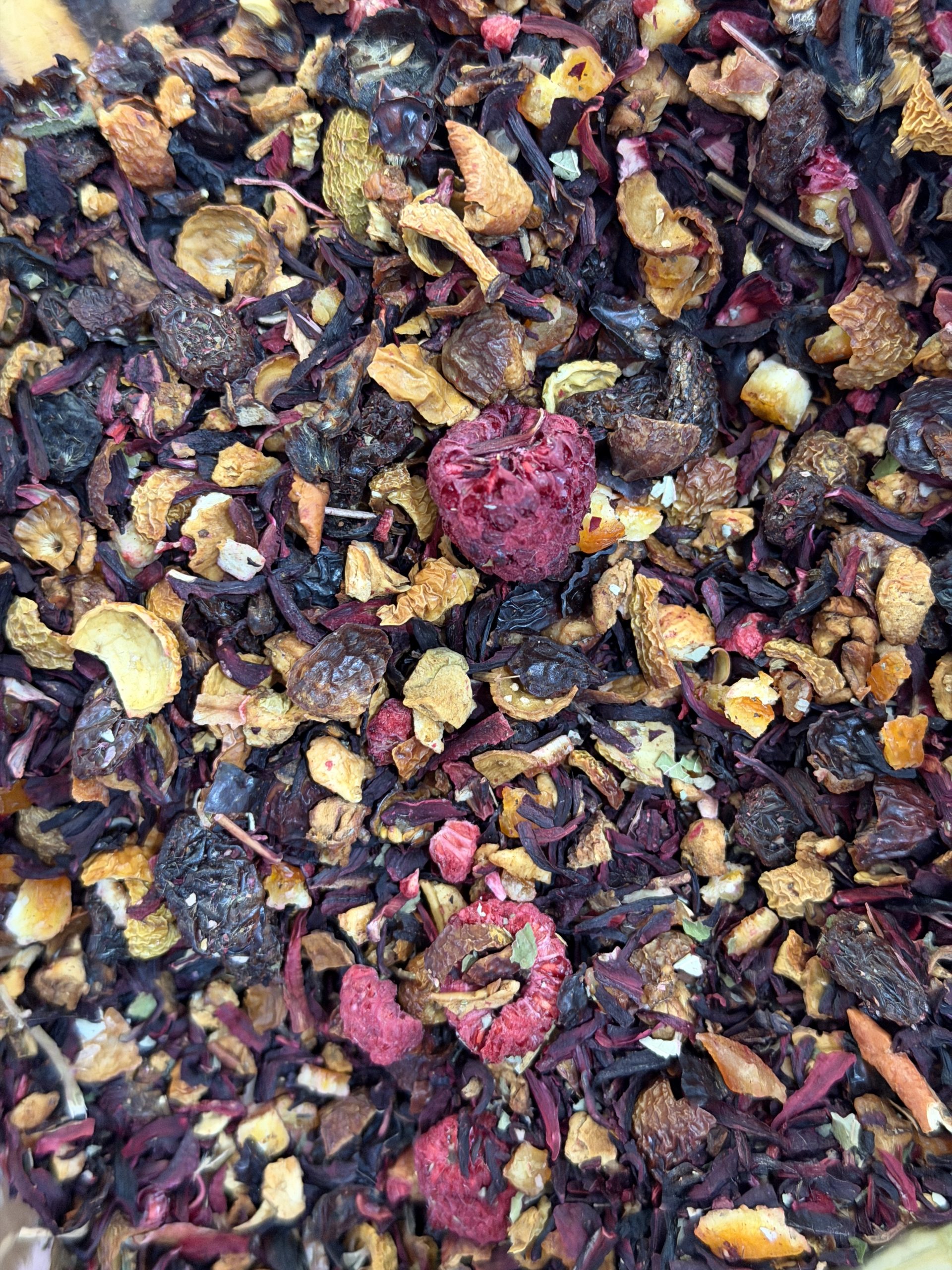 Dzika róża – owoc, Hibiskus, Jabłko, Jeżyna – liść, Malina, Pomarańcza, Rodzynki