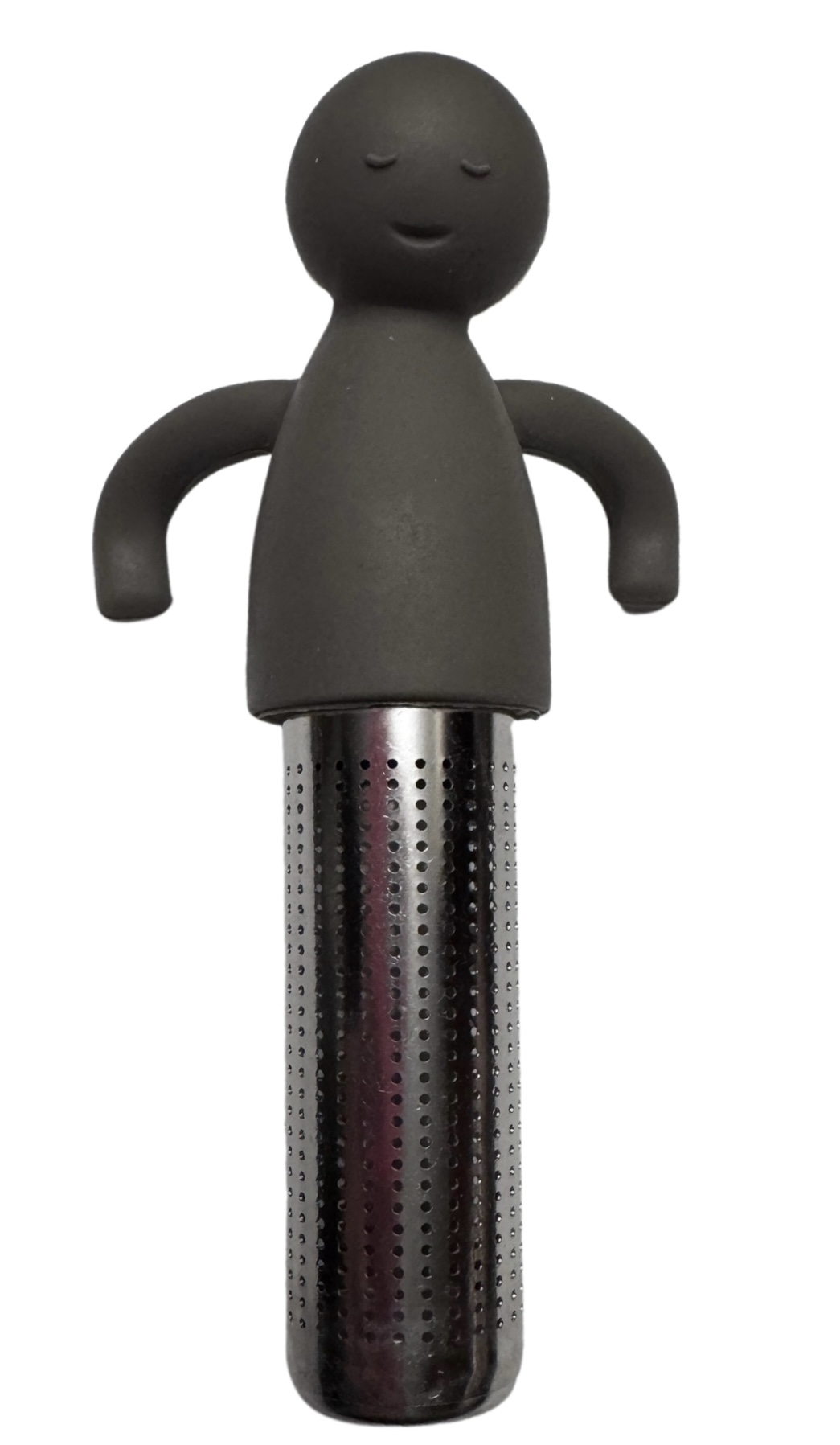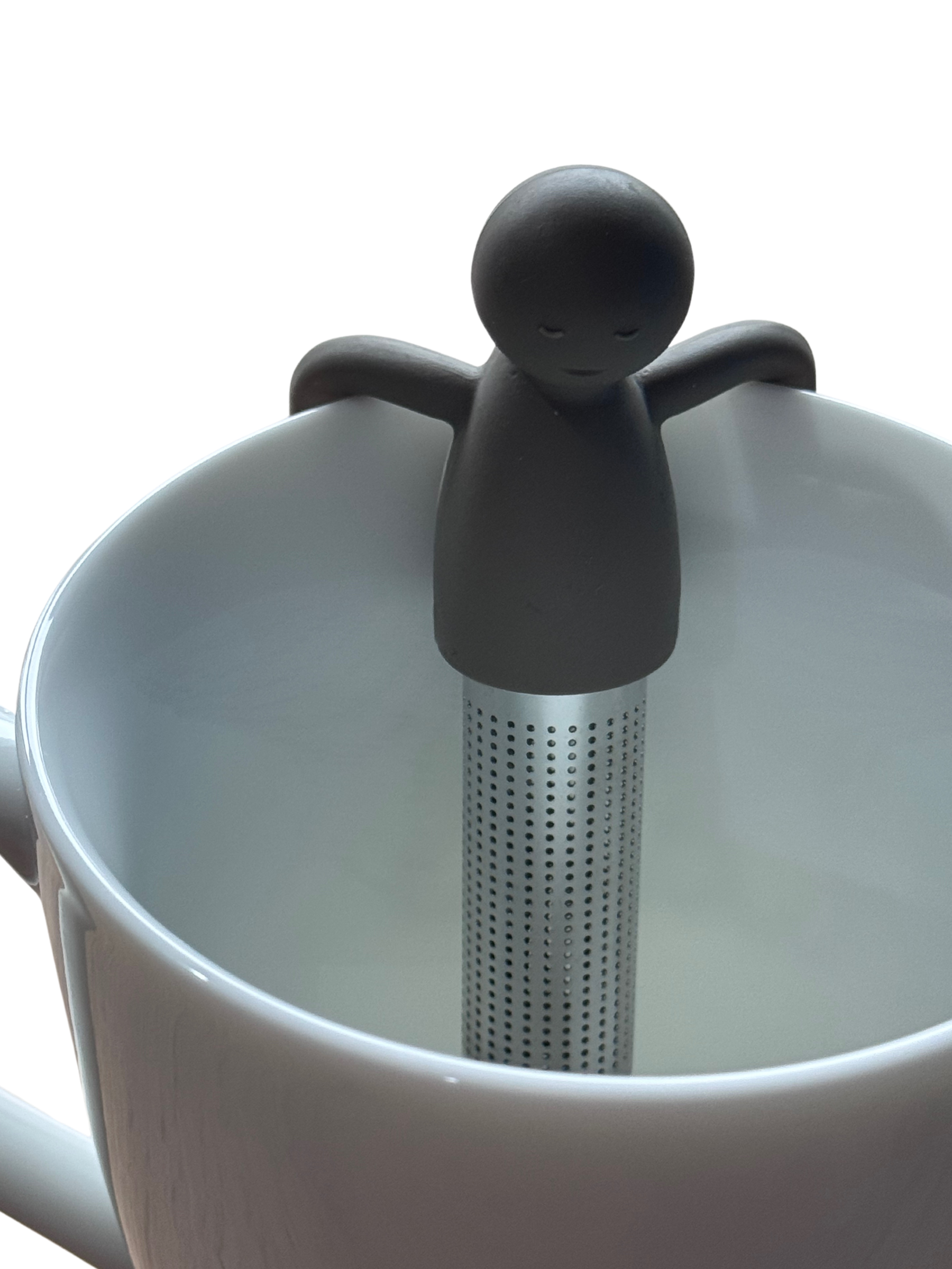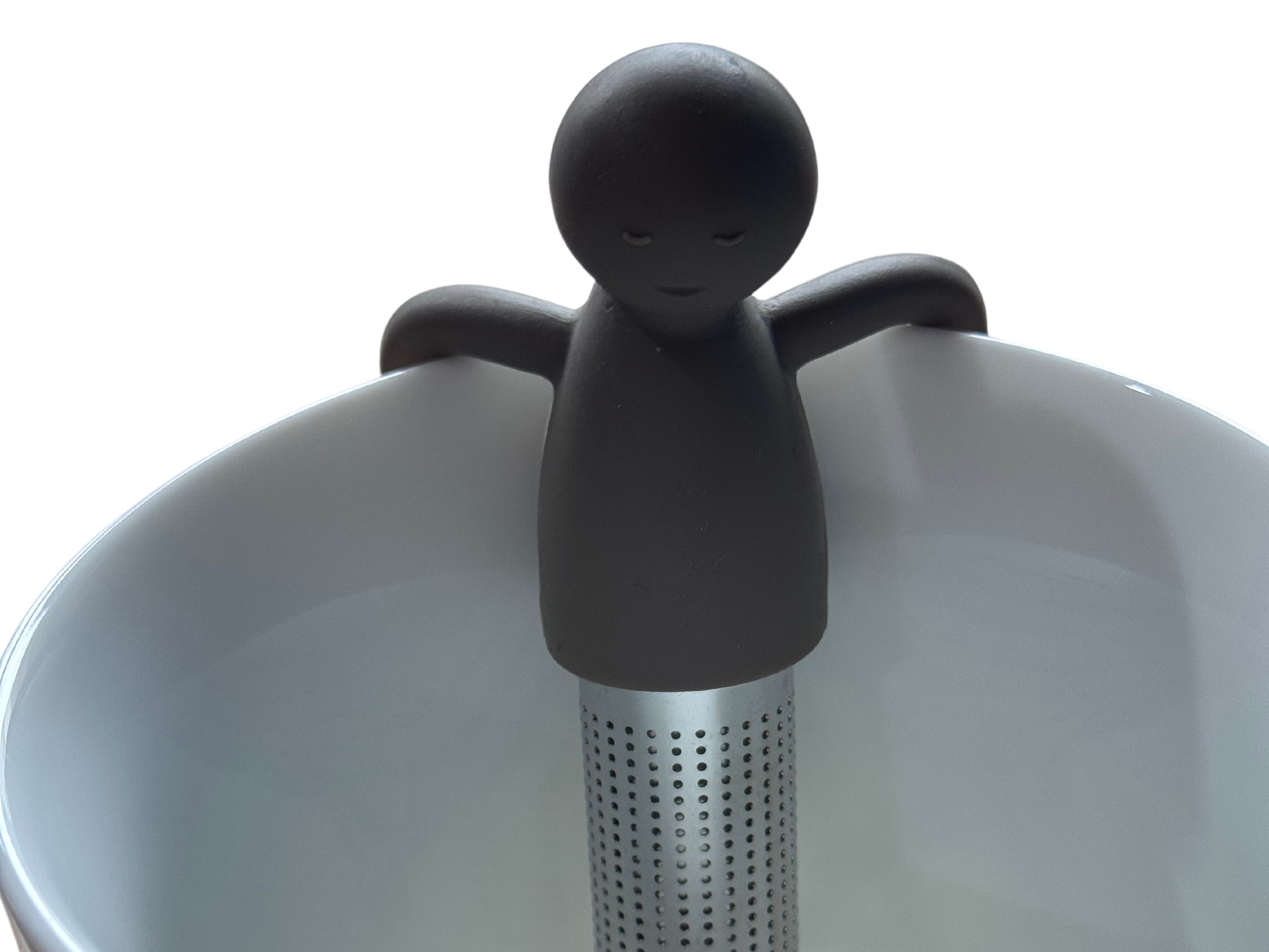 Metalowo-silikonowy zaparzacz do herbaty z kształtem ludzika na kubek.